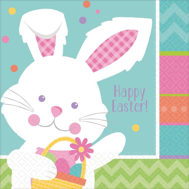 • Chaque petite serviette en papier est dotée d'une palette de couleurs bleu, vert et rose avec un adorable lapin de Pâques tenant un panier avec la mention « Happy Easter »