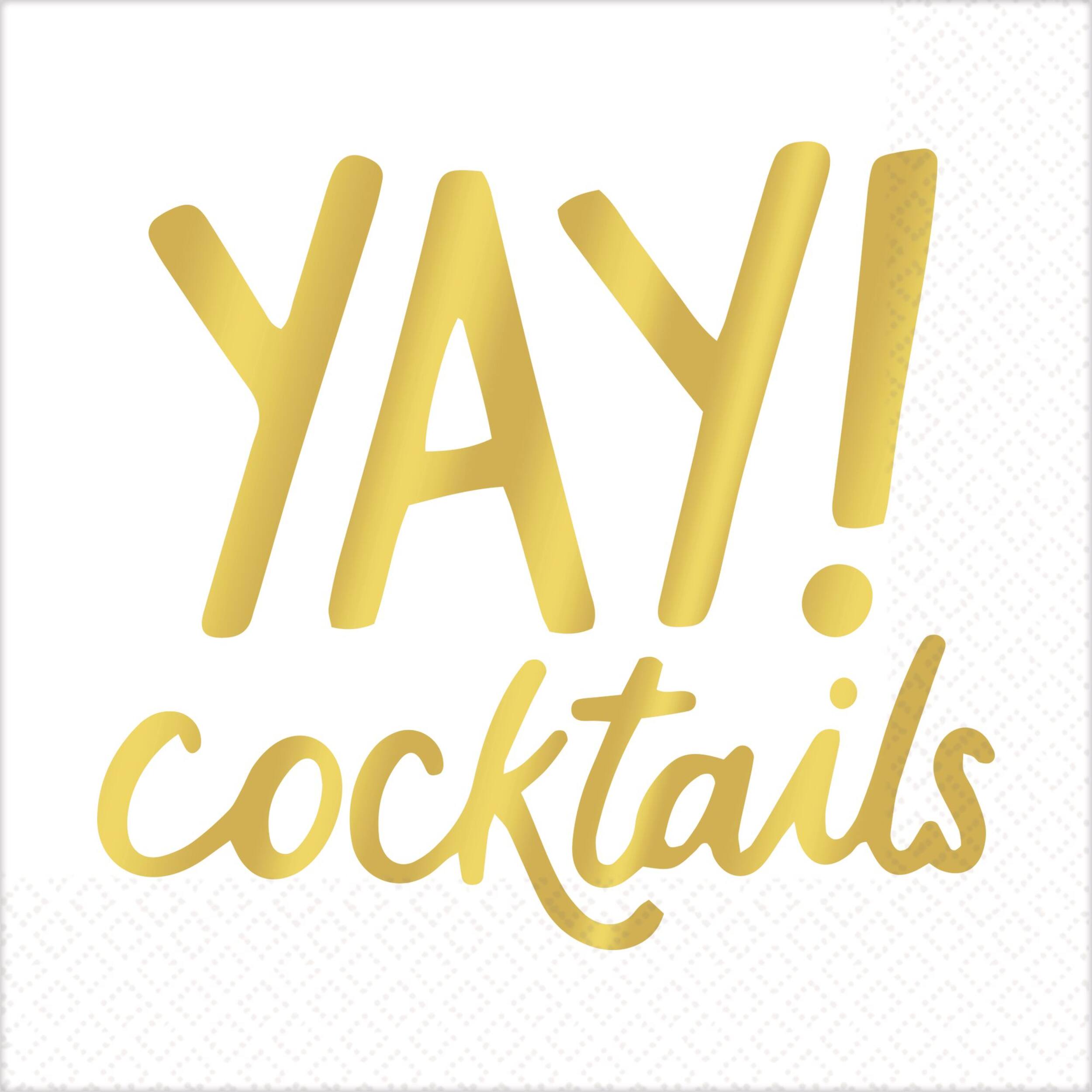 Serviettes de papier blanc ornées des mots « Yay Cocktails » en lettres dorées métalliques