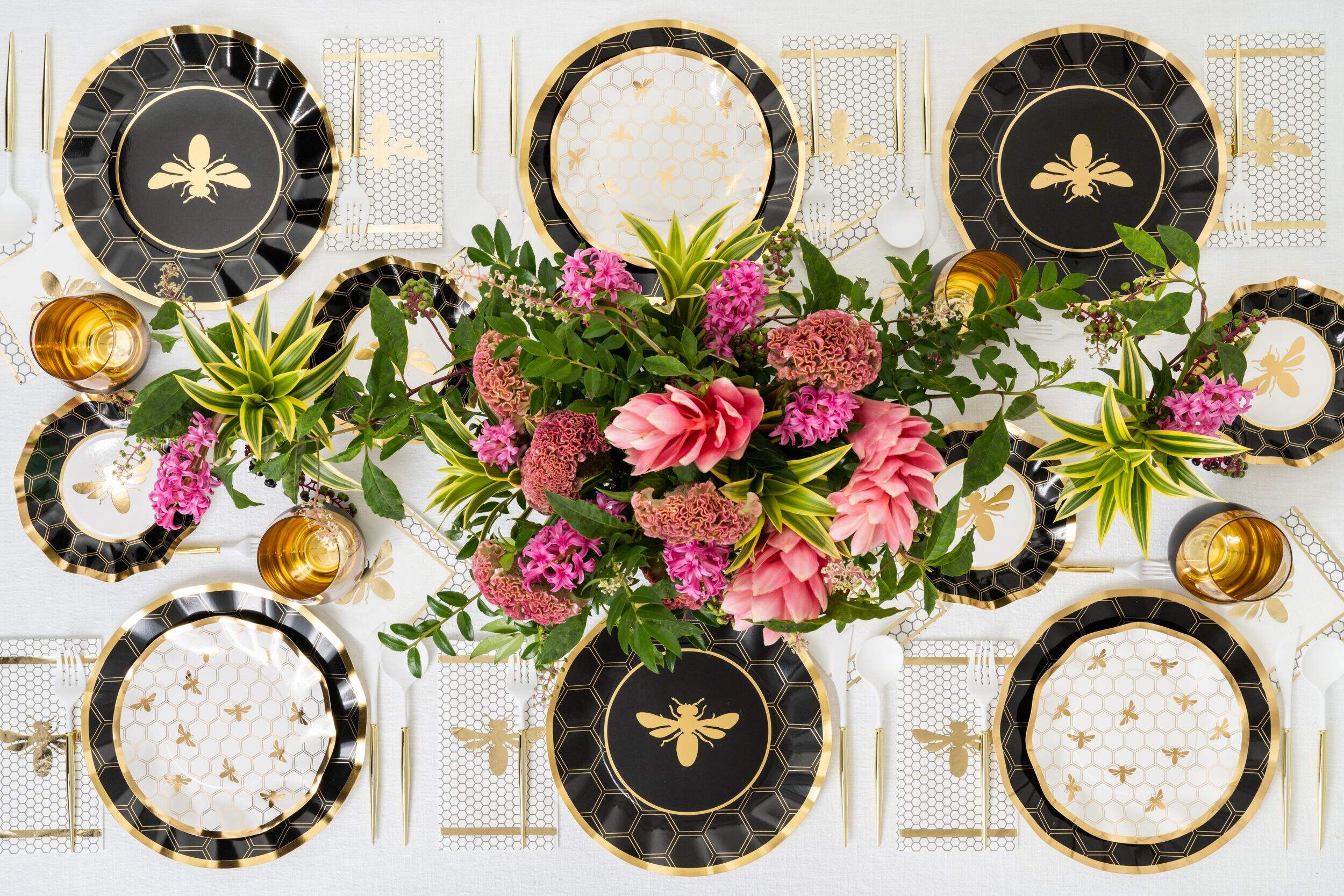Serviettes d’invités 3 épaisseurs Sophistiplate Honeybee dotées dʼun magnifique motif d’abeille noire et dorée avec bordure dorée