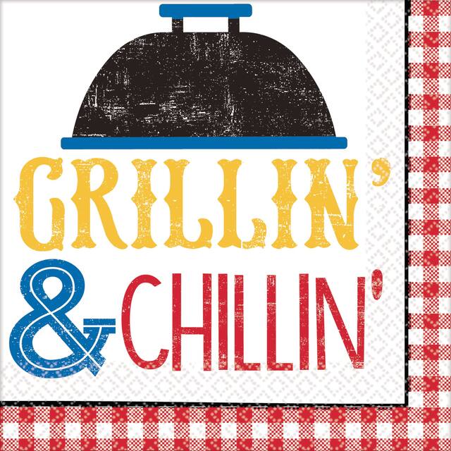 Ces produits similaires présentés ci-dessous pourraient vous intéresser.Serviettes pour boissons Pique-nique Barbecue dotées d'un barbecue au charbon noir avec le titre « Grillin' and Chillin' » en bleu, rouge et jaune