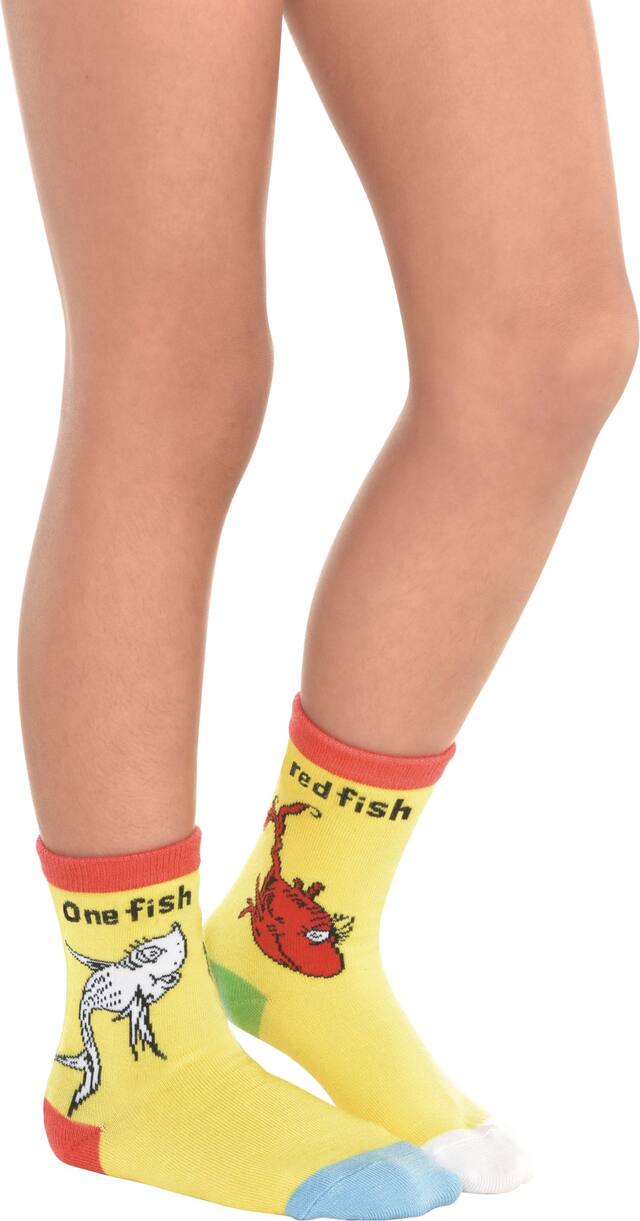 Chaussettes jaunes avec garniture rouge et images de poissons du livre classique de Dr. Seuss de chaque côté