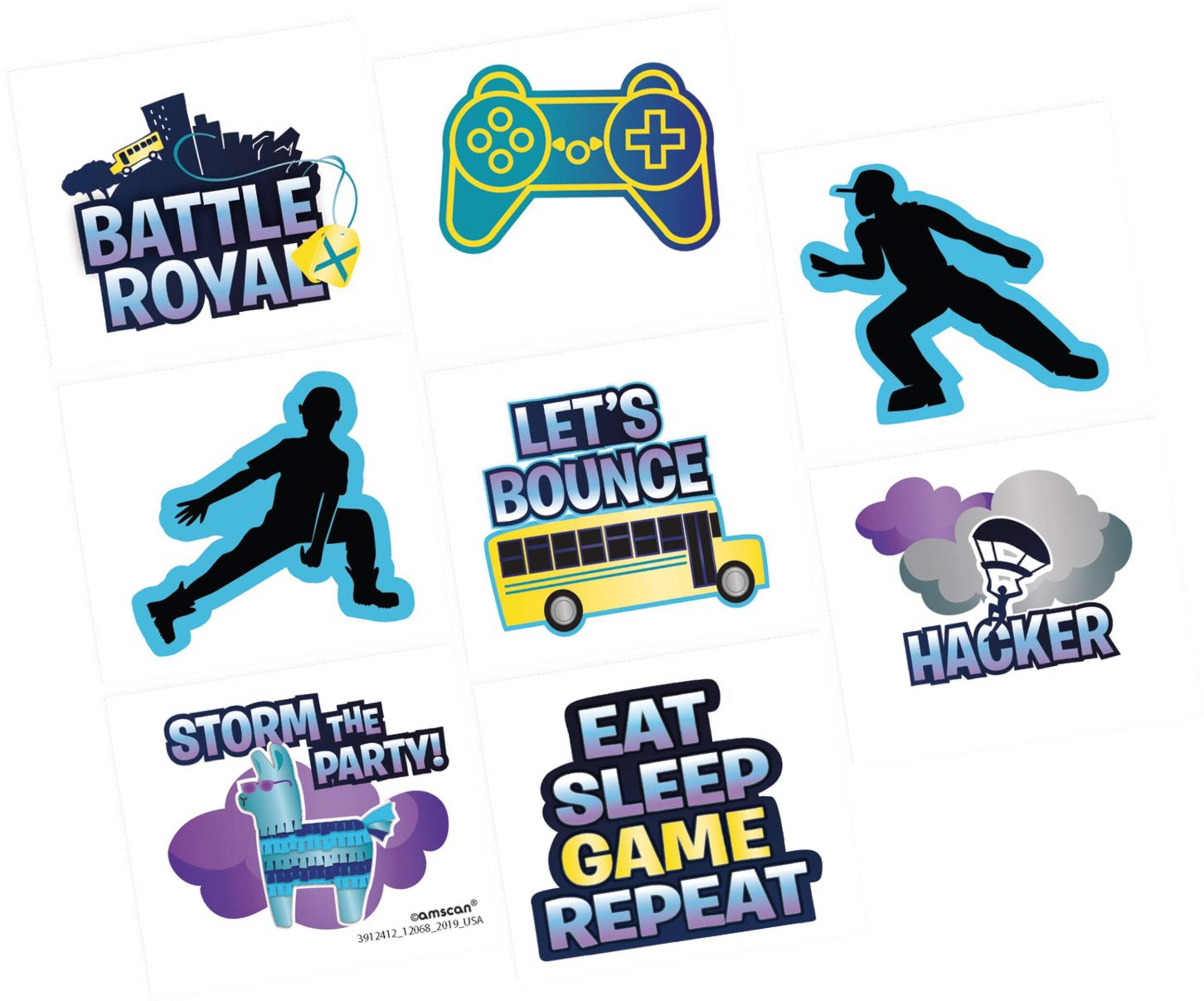 Ces produits similaires présentés ci-dessous pourraient vous intéresser.Tatouages Battle Royal comprenant des silhouettes dansantes, des manettes de jeu et des titres comme « Let's Bounce » et « Storm The Party »