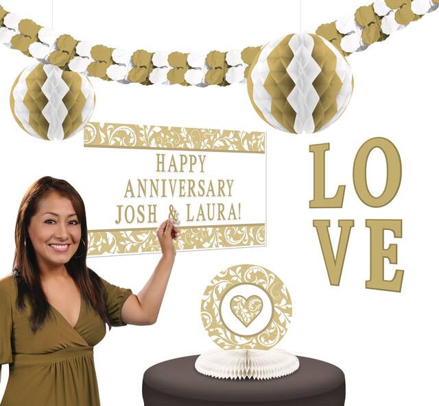 Ensemble romantique doté de décorations en papier doré et blanc comme des boules alvéolées, une guirlande, des milieux de table en forme de cœur et des lettres découpées en papier cartonné qui épellent les mots « L-O-V-E »
