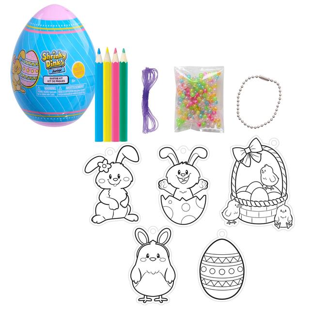 Chaque oeuf comprend 4 crayons, 5 décorations rétrécissantes précoupées, 4 points adhésifs, 2 rondelles, 1 mousqueton et 5 anneaux de saut